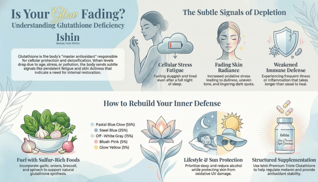 - Glutathione is not just a “whitening ingredient.” It is a core molecule for cellular protection. When it runs low, the body feels it and the skin reflects it.